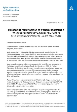 MESSAGE DE FÉLICITATIONS ET D'ENCOURAGEMENT À TOUTES LES ÉGLISES ET À TOUS LES MEMBRES DE LA DIVISION DE L’AFRIQUE DE L’OUEST ET DU CENTRE
